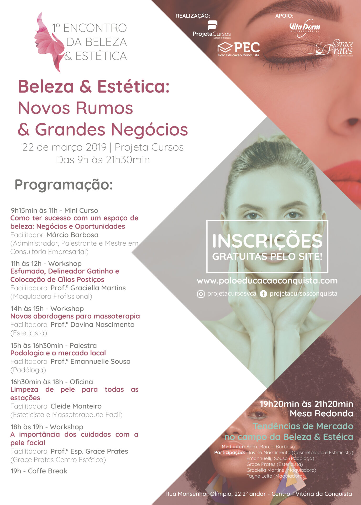 O 1º Encontro da Beleza e Estética – Novos Rumos e Grandes negócios, promovido pela Projeta Cursos, acontecerá no dia 22 de março, das 9h às 21h30 e reunirá vários profissionais do setor. É um evento voltado para profissionais da área, alunos e não -alunos da Instituição, tratando-se de um estímulo a busca por conhecimentos e construção de oportunidades, através de palestras, oficinas, workshops, etc.